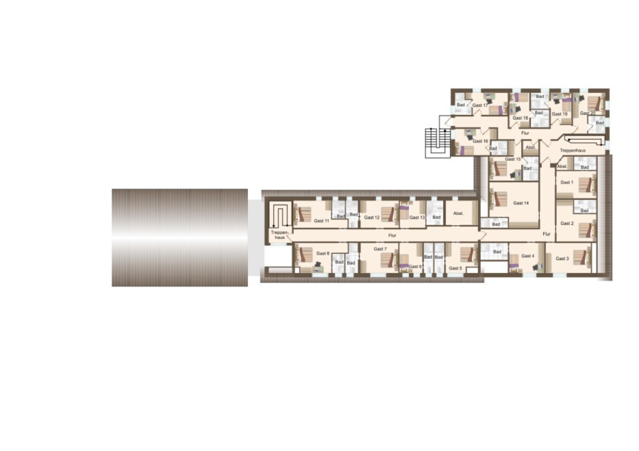Dank der Aufteilung in mehrere Wohneinheiten, der vorhandenen Sanitärbereiche sowie Gemeinschaftsräume (z. B. Gasträume im Erdgeschoss) ist eine flexible Belegung möglich. Die ländliche, dennoch gut erreichbare Lage eignet sich insbesondere für Unternehmen, die in der Region tätig sind und für ihre Mitarbeitenden eine praktische Unterbringungslösung suchen.Ausstattung
