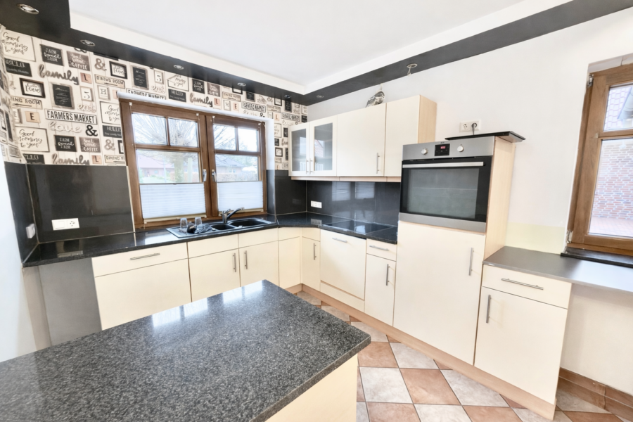Die Küche ist funktional gestaltet und bietet ausreichend Platz für eine individuelle Einrichtung. Angrenzend befindet sich der Hauswirtschaftsraum mit Waschmaschinenanschluss und zusätzlichem Stauraum. Eine weitere Außentür ermöglicht den direkten Zugang ins Freie – ideal, um Einkäufe bequem ins Haus zu bringen.