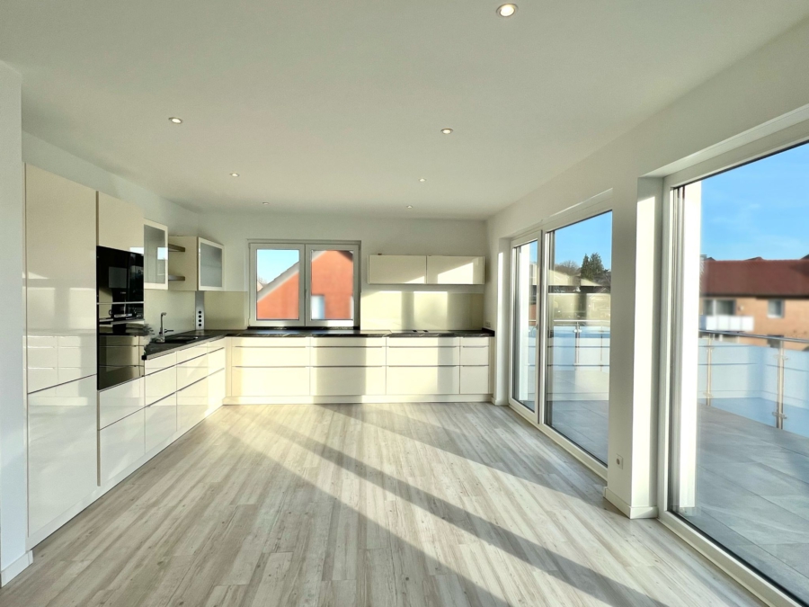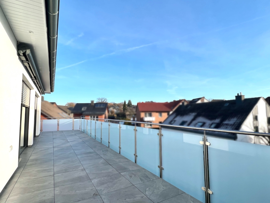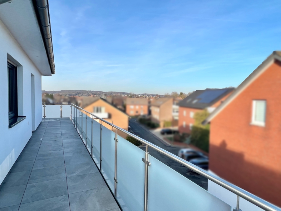 Die offene Raumgestaltung schafft eine freundliche und helle Wohnatmosphäre. Ein besonderes Highlight ist die großzügige Dachterrasse, die sich über drei Seiten der Wohnung erstreckt. Von hier aus genießen Sie einen beeindruckenden Weitblick über die Dächer von Harderberg - ideal zum Entspannen und Verweilen.
