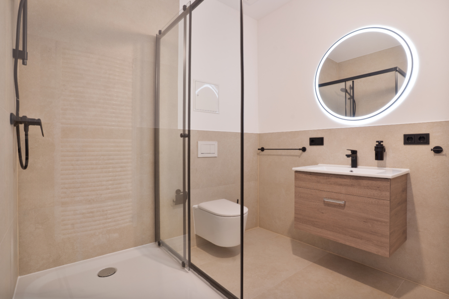 Auch im Innenraum zeigt sich die hochwertige Ausführung: Designfußboden, glatte Vliestapeten, großformatige 120 × 60 cm Fliesen sowie erneuerte Innentüren schaffen ein stimmiges und modernes Wohnambiente. Das Badezimmer wurde zeitgemäß ausgestattet und bietet eine komfortable Dusche mit eleganter Glastrennwand. Das eingesetzte Gira-Schalter- und Steckdosenprogramm unterstreicht zusätzlich den Anspruch an Qualität.