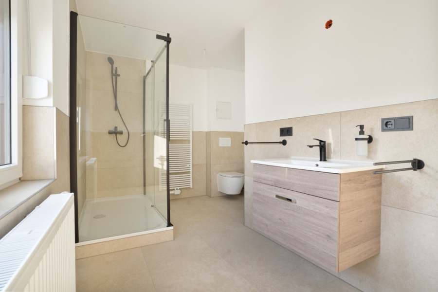 Auch im Innenraum zeigt sich die hochwertige Ausführung: Designfußboden, glatte Vliestapeten, großformatige 120 × 60 cm Fliesen sowie erneuerte Innentüren schaffen ein stimmiges und modernes Wohnambiente. Das Badezimmer wurde zeitgemäß ausgestattet und bietet eine komfortable Dusche mit eleganter Glastrennwand. Das eingesetzte Gira-Schalter- und Steckdosenprogramm unterstreicht zusätzlich den Anspruch an Qualität.